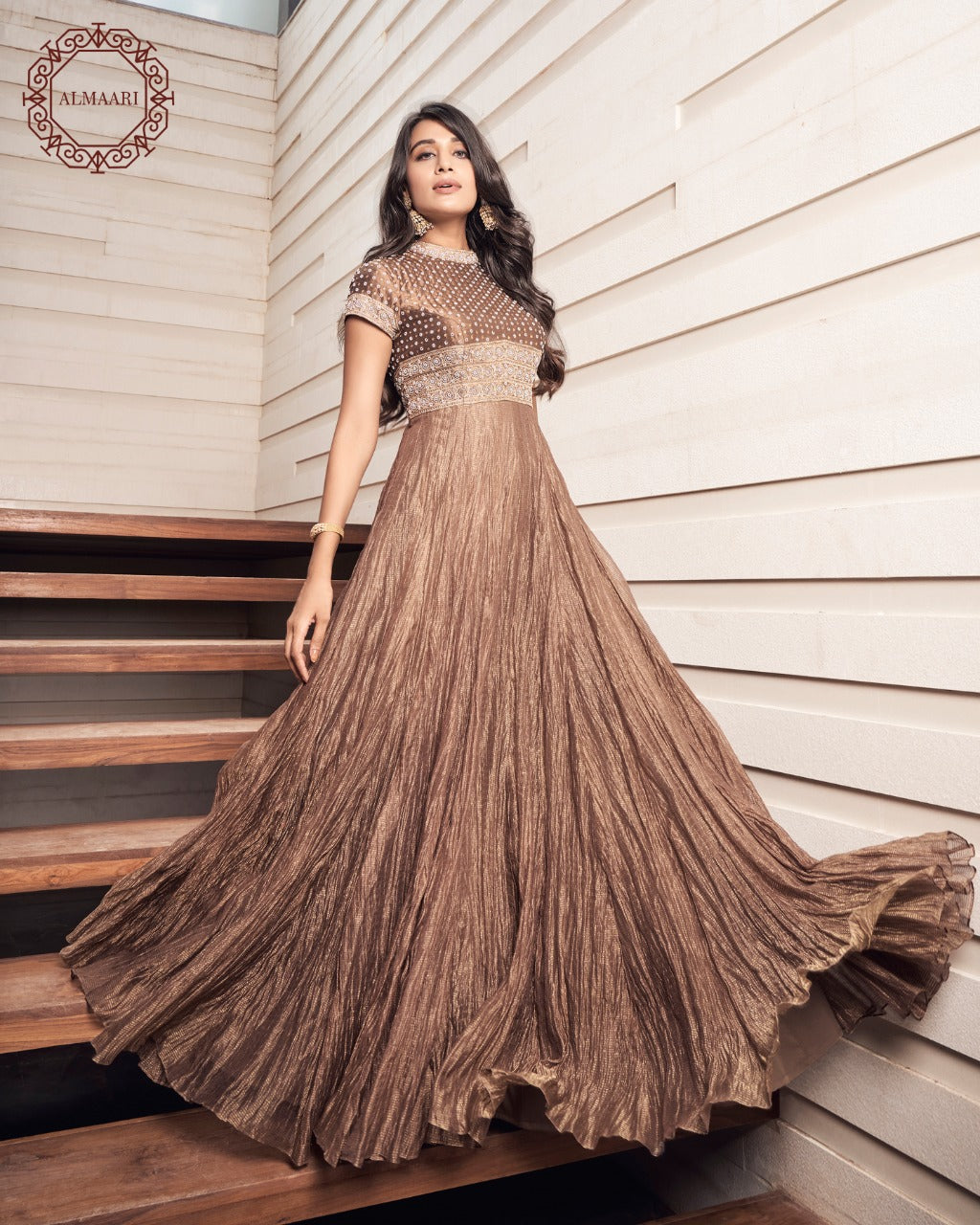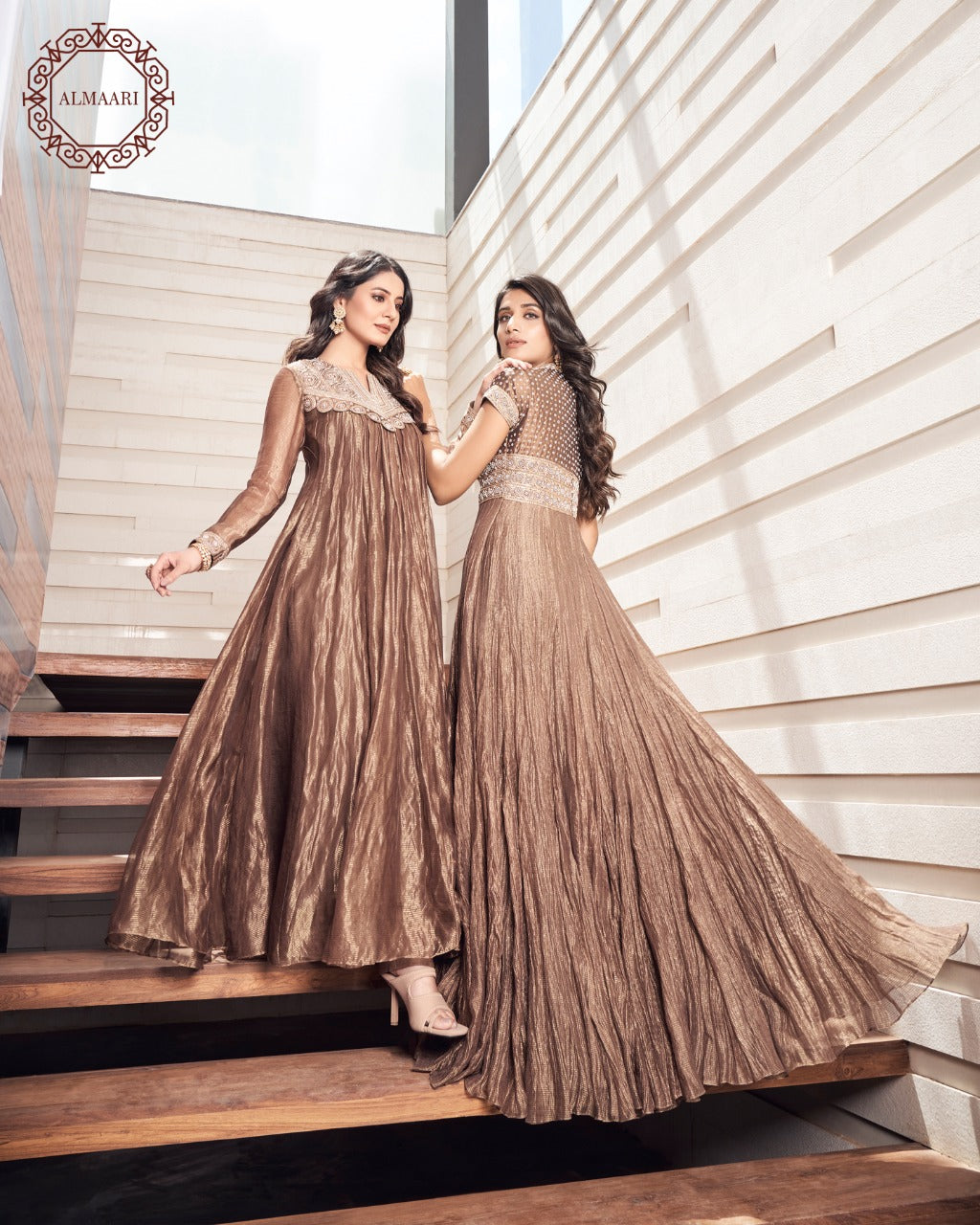 Our Brown tissue crushed gown is embellished with intricate Pearl, Pita and Kasap work.