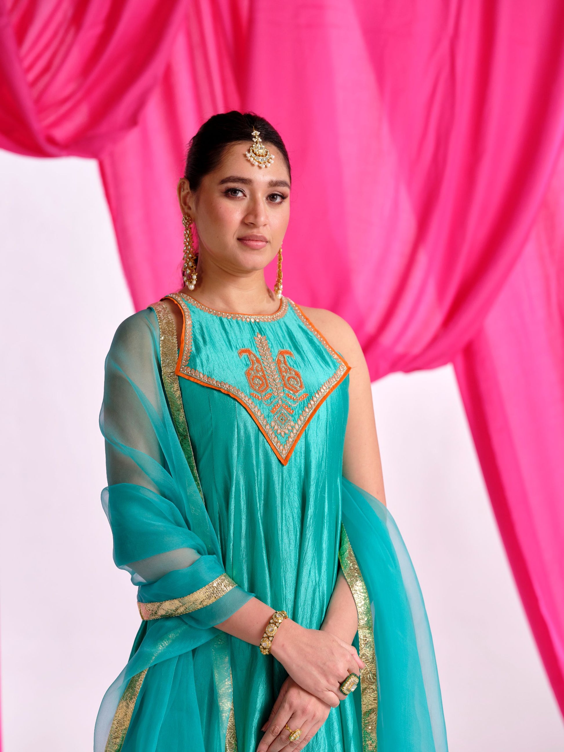 This set pairs a silk fabric top with a flat silk bottom and an organza dupatta. The intricate Gota, thread, and Aari work add a touch of opulence to the ensemble.