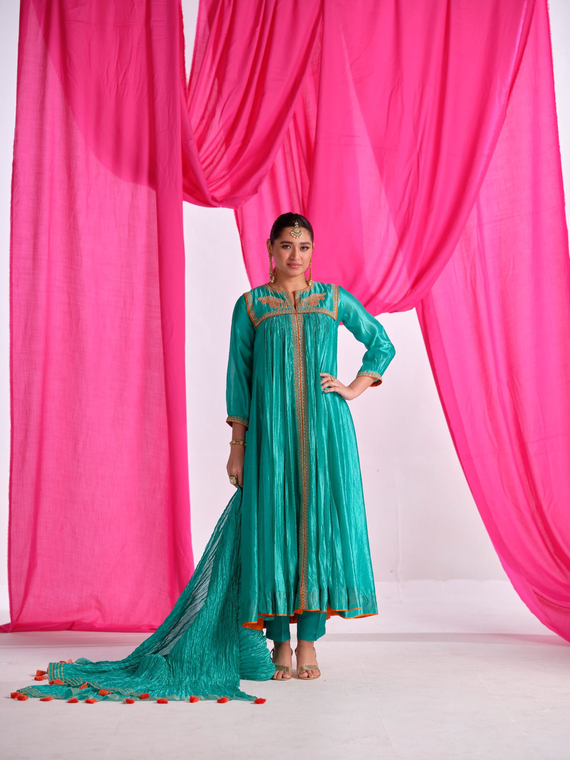 A set featuring a silk fabric top paired with a flat silk bottom and a silk dupatta. The intricate Gota, thread, and Aari work lend a regal charm to this ensemble.