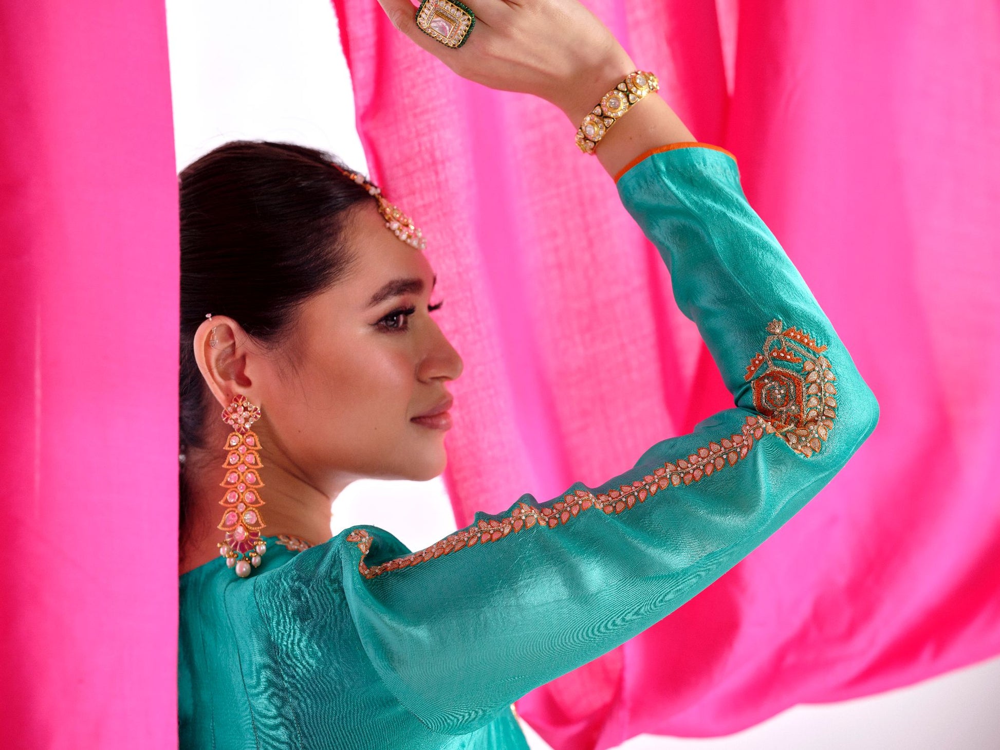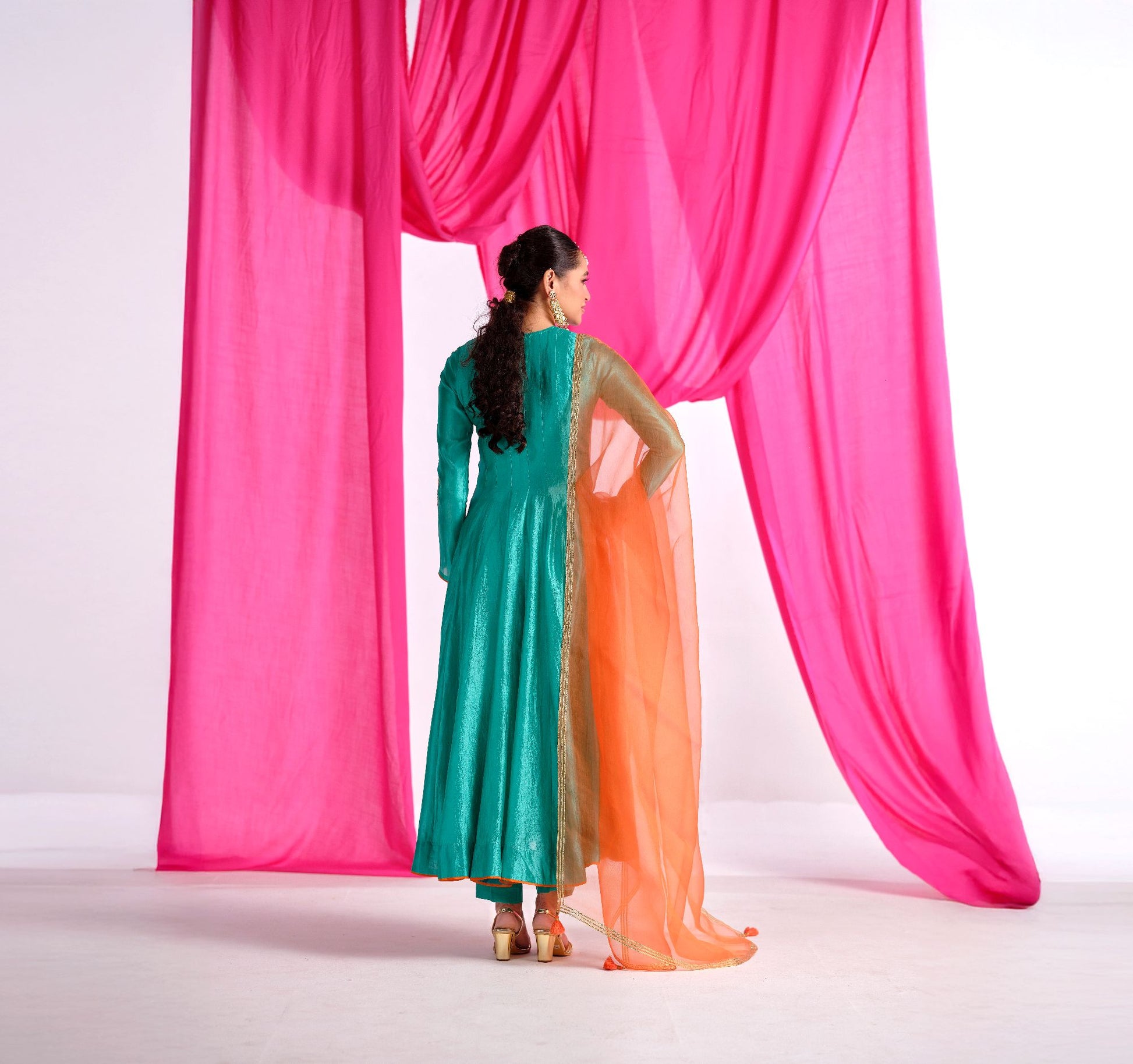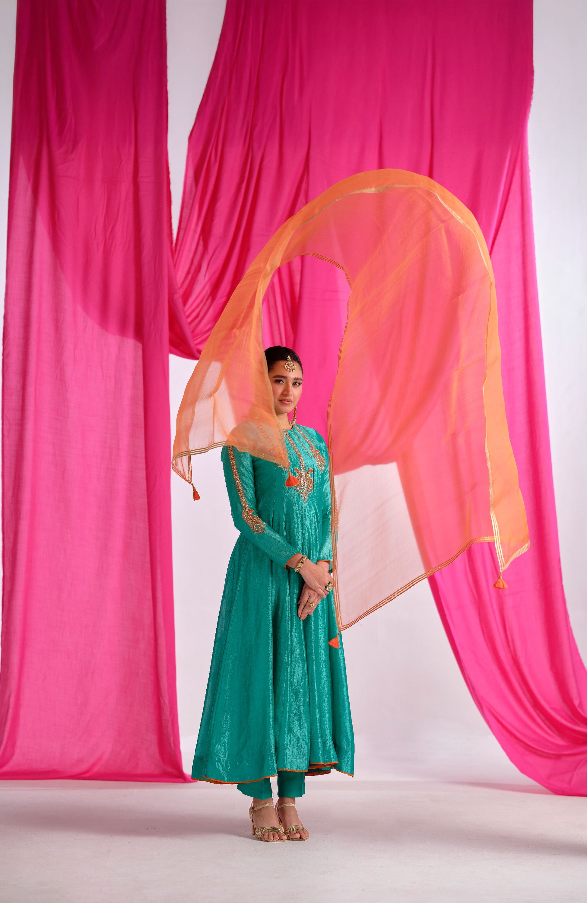 This outfit combines a silk fabric top with a flat silk bottom and an organza dupatta. The ensemble is adorned with exquisite Gota, thread, and Aari work, making it perfect for special occasions.
